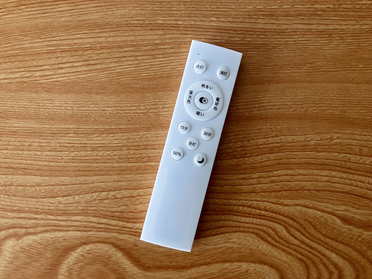 また、このリモコンのボタン一つで明るさを半分にしたり、昼光色と電球色を切り替えられるのが意外に便利です。