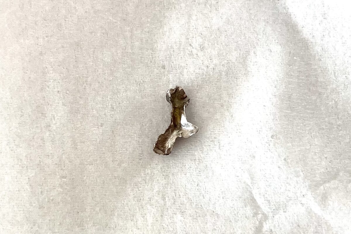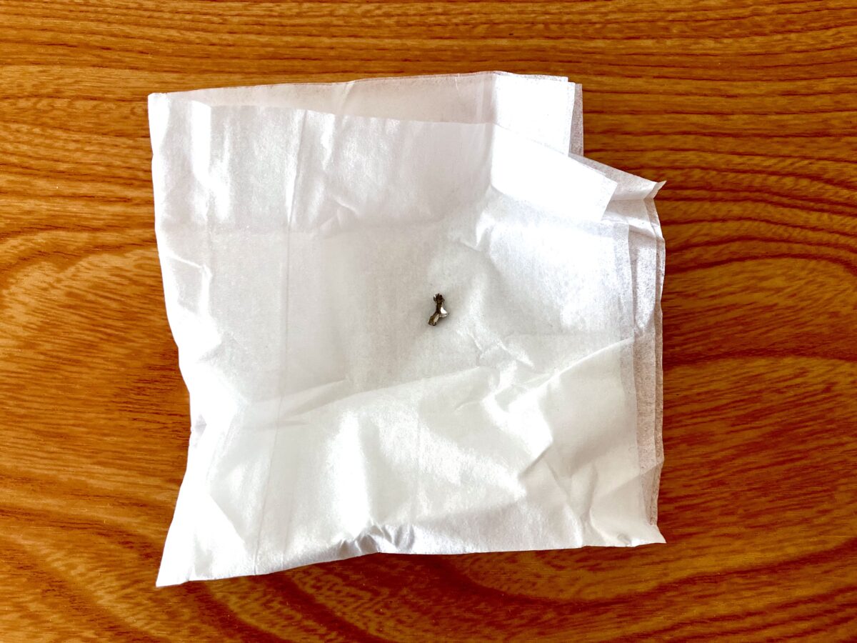 甘くて柔らかいものを噛んでいたのに、いきなり金属のような感触でガチっと硬いものが歯に当たり、めちゃくちゃ嫌な予感がしつつも口から出してみたら、自分の歯の詰め物がキレイにすっぽ抜けていました。