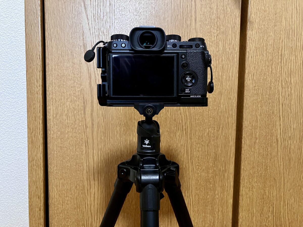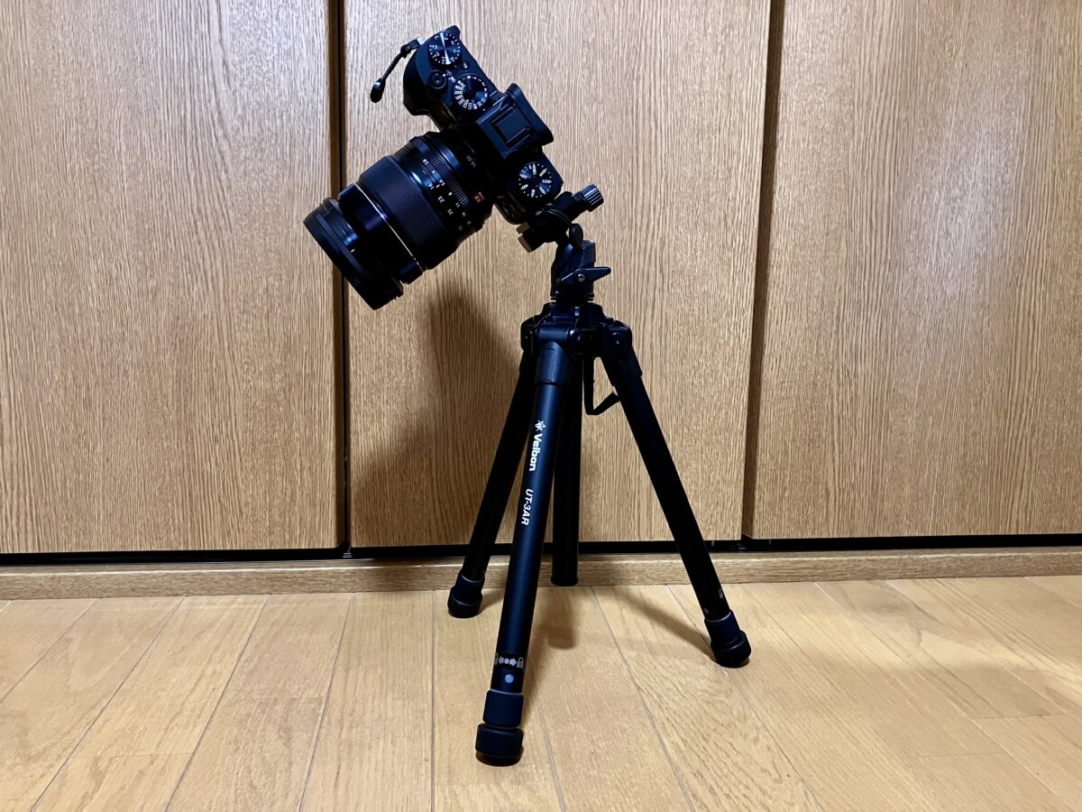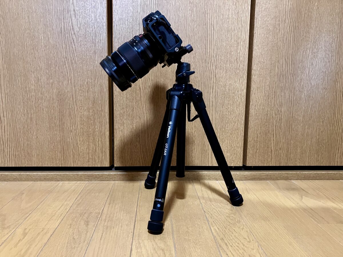 三脚の使い方としては間違っているというか、よろしくない使い方なのですが、負荷とバランスを試すためにこのように設置してみました。